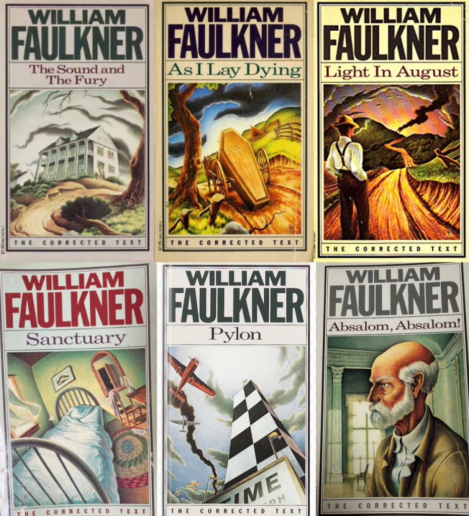 The Southern Gothic plot revolves about the transportation of a body in a coffin, and I liked a cover illustration on a 1980s paperback edition that was clearly in the style of Thomas Hart Benton. An internet search showed multiple Faulkner covers from that era that were designed by the late Carin Goldberg, with illustrator David Tamura imitating Benton.