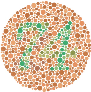 The one sure diagnostic I’ve found for my condition is the Ishihara 9.  That’s the image on this post, part of the color test published in 1917 by Tokyo physician Shinobu Ishihara.  If you have normal color vision, you should see the number 74 in it.  I see the number 21 instead.