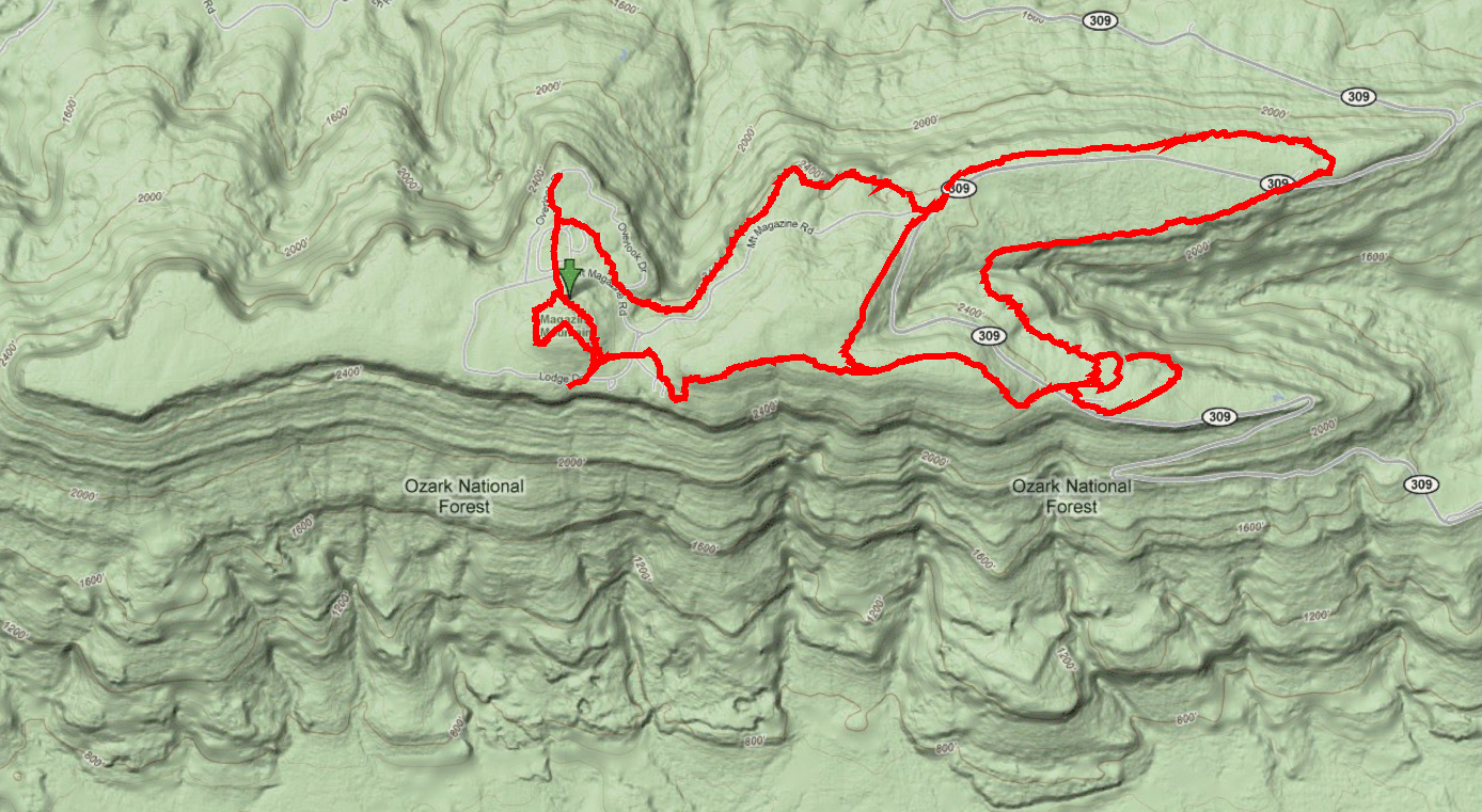 So in less than a week I’ll be heading back down the Muskogee Turnpike and I-40 to Arkansas. I greatly enjoyed circumnavigating Mount Nebo over Spring Break, so I’ve set my sights this time on Mount Magazine just west of there. It boasts the highest point in Arkansas, promises temperatures 6 to 20 degrees cooler than down below, and has a great lodge. I can’t afford to stay there, but I’ll certainly make use of its restaurant. For a nice shower, bed, and blogging support I’ll make use of a room an hour’s drive away in Russellville.
