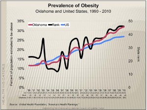 One thing I find particularly striking is how fat Oklahomans have become. When I hike in Colorado or hike or walk city streets in the Pacific Northwest, people are much thinner and healthier. Our whole culture is eating improperly and not getting enough exercise, but Oklahomans are worse off in part due to their poverty. The poor buy cheap processed food which is less nutritious and higher in calories, and easier to prepare, than more expensive fruits and vegetables and the various ingredients needed for healthier cooking, which also takes more time and is a greater relative burden for the stressed-out working poor.