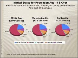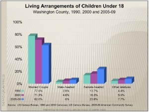 The United Way’s profile shows the changes in the homes those children grow up in. The percentage of folks in Washington County who were 15 years or older and married plummeted from 62% in 2000 to 55% in 2009. I’m part of the problem, of course: my “never married” group has risen from 18% to 23% in that time.