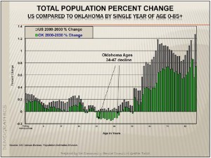 Overall, Oklahoma is shedding folks who are between 34 and 47, and this cripples our economic power and tax revenues. Hence the importance of the young professionals groups here and in Tulsa who seek to improve the environment for their peers and thus staunch the flow, helping young adults have a happier stay in our state so they remain with us as they mature into their late thirties and early forties.