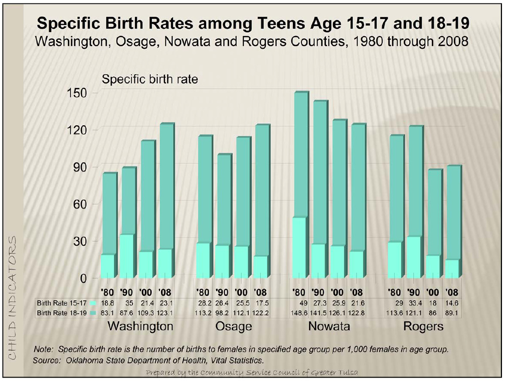 The percentage of teenagers giving birth in Washington County rose from 10% in 1980 to 15% in 2008.