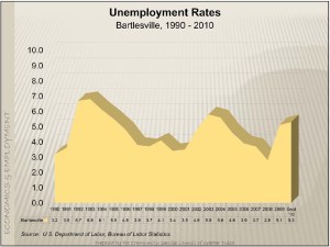 The Great Recession we have lived through in recent years is shown in rising unemployment here in Bartlesville, but happily the overall rate remains low and has not even reached the rates we saw in the recession of the early 1990s.