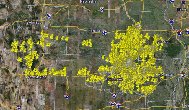 I find this fascinating. You can see the tracks from my trip to Pagosa Springs, Colorado last summer. And I’ve managed to smother with cell tower pickups all but the northwest quadrant of Oklahoma, along with big chunks of Kansas, Missouri, and Arkansas.