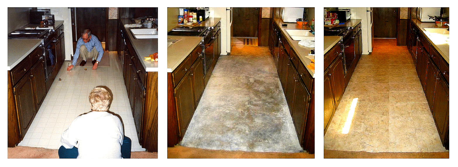 A month later the tile wall above my bathtub began to collapse. The seal was gone and the tile affixed to ordinary drywall rather than greenwall, so rot and mold had set in and undermined the wall all around the tub. The vinyl floor in my kitchen also looked bad and was peeling up, so I asked a couple of contractors for estimates. Their high prices led me to look for an alternate approach.