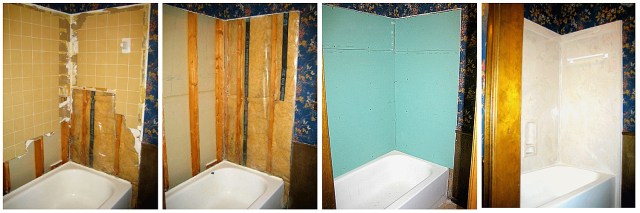 I know my manual dexterity is poor, so I’m leery of power tools. But I bought a small reciprocating saw and went to work, peeling away the rim tiles and pulling out the rotten sections of the wall, then cutting out all of the rest. My only goof was dropping a section on the edge of the tub, chipping the porcelain. A patch kit from Wal-Mart solved that, and the odd bump on the tub is my “sinister reminder” of my own ineptitude! My kindly neighbor, who has since passed away, offered to haul the tile walls to the dump for me in his pickup.