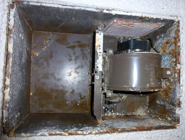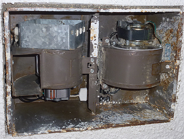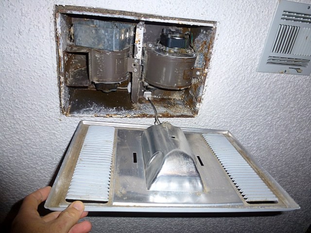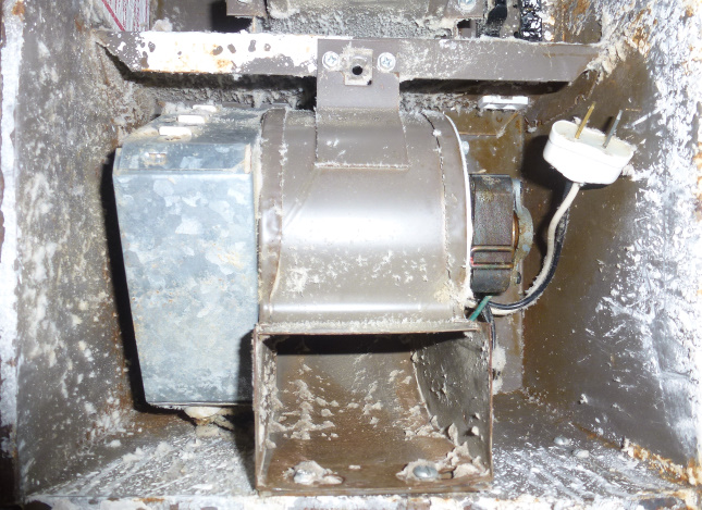 So I finally screwed up my courage and dismantled the ceiling unit to see if I could possibly repair, rather than replace, it. When I first opened up the unit, it was caked with dust and lint. I vacuumed it out and lubricated the fan and motor, but that didn’t help.