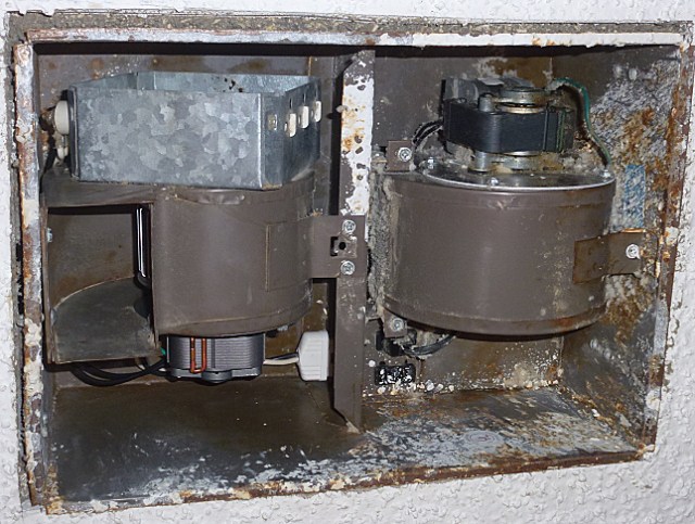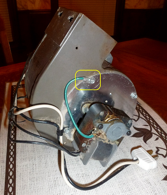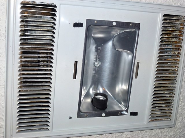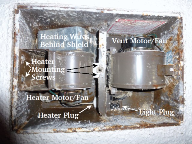 That complication was enough to keep me from pursuing a repair. When the heater fan gave up for good I went out and bought a cheap space heater with GFI shock protection at Wal-Mart and used it on the floor of the bathroom. But it blew air at the shower curtain, not down into the shower, so it was far less effective.
