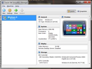 I cleared some space on my crowded hard drive since PC World’s instructions for installing a Virtual Machine to run Windows 8 indicated I might want to allocate more than 20 gigabytes for this experiment. I shifted my old iTunes television shows onto a networked hard drive to gain 30-odd gigabytes back, boosting the free space to almost 100 gigabytes. I then downloaded and installed Oracle’s VirtualBox, using the fairly helpful directions from PC World, choosing to let it use four of my eight gigabytes of RAM, allocating 40 gigabytes to its dynamically allocated drive, and on my own initiative adjusting a setting so that it could simulate 4 processor cores since my i7 920 processor supports hardware virtualization.