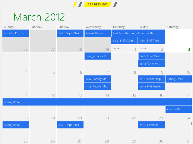I also tried People and found it was a contacts list or address book. It too was already populated, but at least it had obvious buttons to allow me grab contact information from Facebook, Twitter, and so forth. That’s more like it. Maybe they’ll have this sort of thing in Calendar when the app is finalized…but maybe not.