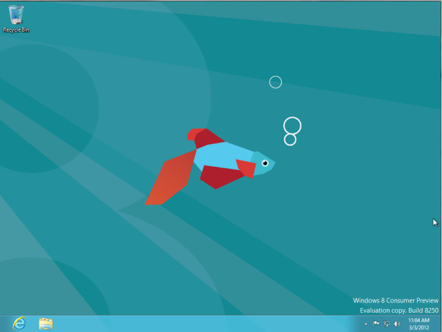 The familiar Windows Desktop is still present in Windows 8, complete with a truly hideous default desktop wallpaper of a pathetic drawing of a Betta fish. Ha ha – this is beta software. I didn’t get the joke at first, and it looks like they want the desktop to look so horrible that users will happily flee back into the Metro interface.