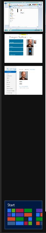 Microsoft should put something visible in the corners of the screen to help users learn and remember how to activate the charms and the task switcher. It took until Windows 7 for Microsoft to put a permanent “Show desktop” spot on the Win7 taskbar, rather than an often missing and easily deleted shortcut icon. And even then it left the Show desktop button unlabeled and transluscent so most users wouldn’t even spot it. Now it has shifted to completely invisible interface buttons. I guess it wants users to feel as clueless as Microsoft appears to be these days.