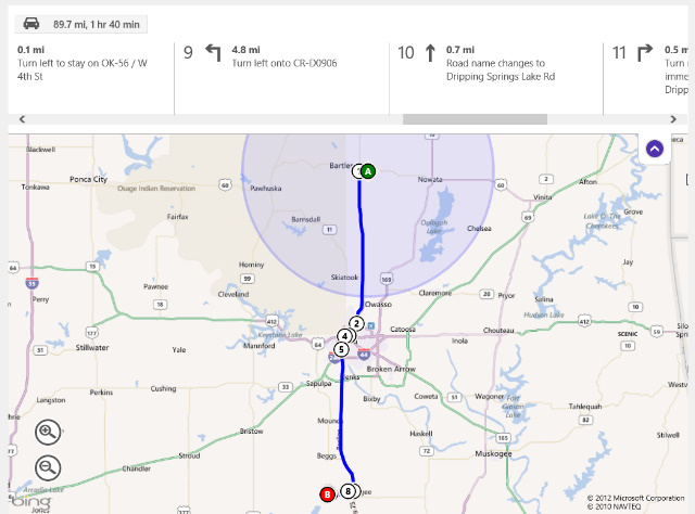 Nice app, and click and drag does what it should: move the map around. Why the Weather app can’t figure out that click and drag should scroll the weather info remains a mystery. But when you get directions in Maps, neither click and drag nor the arrow keys will advance the direction panes…instead you’re back to using the scrollbar. Microsoft will seemingly never pose a challenge to Apple when it comes to designing user interfaces.