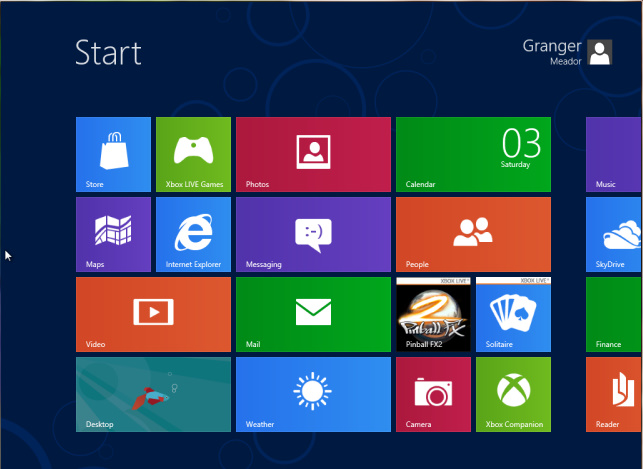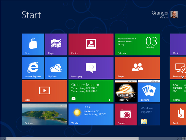 I was a bit surprised more of the icons hadn’t shown signs of life. But Desktop showed the better wallpaper I had slapped over that hideous Betta, weather showed current conditions and forecast high/low, Mail showed the most recent flattering message, Calendar showed today’s appointments, and Finance showed the stock market indices. I was surprised Photos didn’t show the currently selected photos in that viewer, Internet Explorer didn’t show a thumbnail of the currently displayed page, and Maps didn’t show a map thumbnail either. Maybe you wouldn’t always want such thumbnails to be visible? Maybe you can customize the tiles to show them? I’d have to experiment more later on.