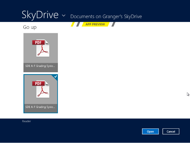 This is a PDF reader, I guess. I uploaded a couple of PDF files to SkyDrive and was unamused to find that double-clicking the icon for a file did not open it. Instead I had to click to select a file and then separately click a dedicated “Open” button. That cinched it – Microsoft’s own app developers are not following consistent interface rules. Pathetic.