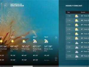First up was the new Weather app. It asked for permission to locate me and quickly brought up the Bartlesville weather. I could click on the daily weather info for more details, including different forecasts from weatherunderground and weather.com. I could use the minimalist scrollbar along the bottom edge of the screen to slide the Metro view sideways for hourly info, maps, and more. That was okay, but the Metro interface would clearly be much faster and easier to use with a touchscreen. I felt I should be able to click and drag to slide the screen over, but the scrollbar was the only obvious way to reveal the additional information. I get that different Metro apps would use click and drag for different functions, but why not have the Weather app interpret a click and drag to mean to scroll the screen? Is that not obvious?