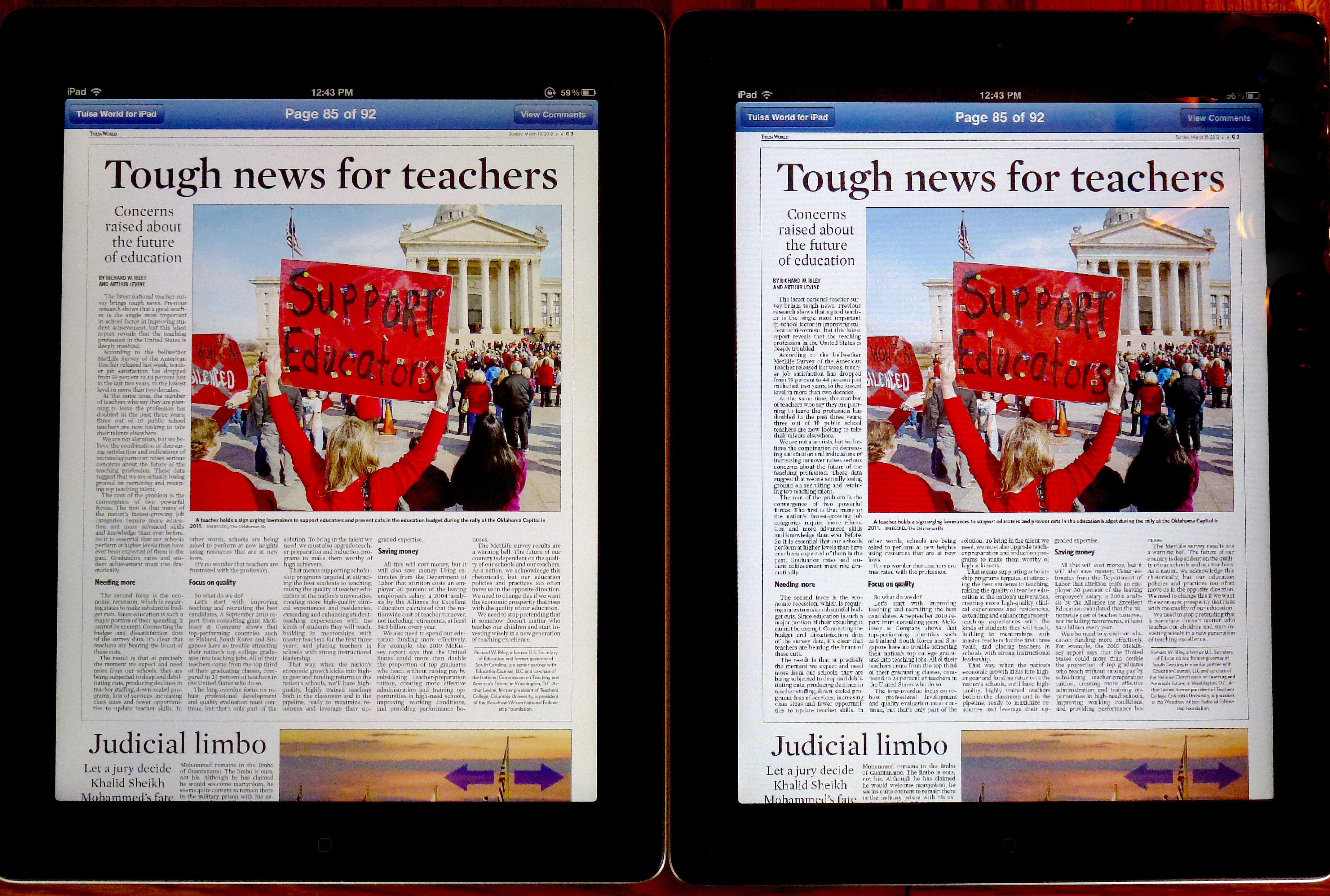 The only time the resolution of my iPad 2 bothered me was when viewing a full-page article in the online Tulsa World, like the one above. The text would have occasional artifacts of letters in the same word being thicker and thinner. They were still readable, but it was annoying enough that I would often zoom in to get rid of it. The new unit eliminates that problem, but if I didn’t have a use for the old unit I might have regretted investing so much in the new one.
