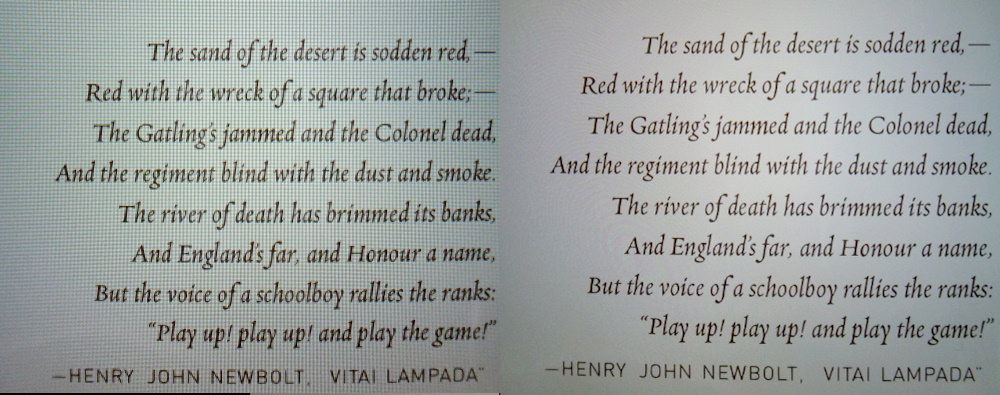 And since this blog post is limited to about 640 pixels wide, you can’t readily perceive the difference here. You can click on the picture below for a higher-res shot. If you zoom in on it, you’ll be able to see the difference in the text. But while it is visible, it is not startling when you are using the unit in real life. (The new iPad is on the left in that shot; the iPad 2 is on the right.)