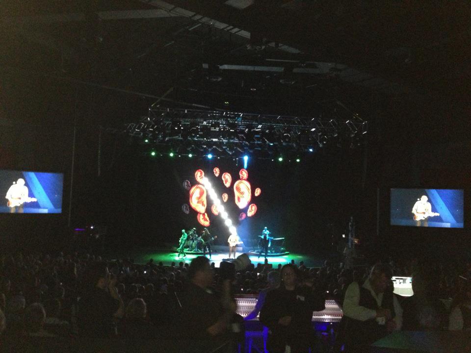 on the iPhone 5 tonight. I didn’t have subject matter worthwhile to post the photo, howeverof the orchard along the Pathfinder Parkway. Previously I’ve used the Autostitch Panorama and PhotoSynth apps for such functionality, but having it built into the normal Camera app makes it far more likely to be used. However, the iPhone 5 camera is no match for my Canon superzoom camera; most of the photos I took at a Steve Miller Band concert last night at the Hard Rock Casino in Catoosa were unimpressive; here’s the best of the bunch after some cropping and Photoshop tweaking, and the original photo is shown below, which was shot with the flash on – shots without flash led to massive blooming and oversaturation of the performers on the brightly lit stage.