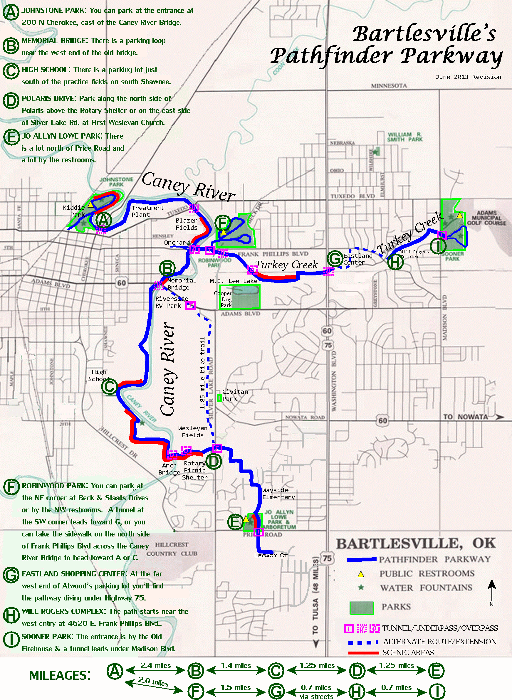I already knew the mileage of my favorite routes, but everyone has their own favorite starting and stopping points on the trail system. So I decided to kick off my 2013 Summer Break by thoroughly mapping the mileages between all of the obvious waypoints along the entire pathway. I used that information to update my map, rationalizing the order of the various parking areas so that I could create a “add up your mileage” graphic to the bottom of my online map.