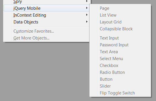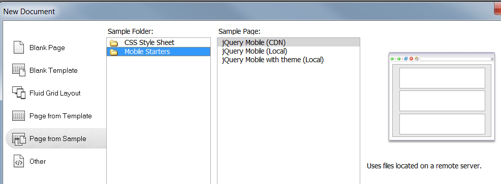 Browsing through Dreamweaver’s New Document dialog box, I came across some sample “Mobile Starter” pages written using something called jQuery Mobile. I started messing around with those and liked what I saw. Clean, simple boxes with big buttons and a variety of options for displaying links and information. Clearly the resulting site would look silly on a big screen, but it would be quite easy to navigate on a small smartphone.