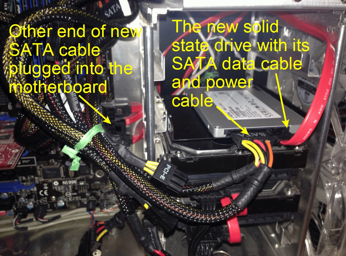 Next I hooked one end of the keyed SATA cable which came with the installation kit to the new drive. The other end keyed into an empty port on the motherboard. I found an unused SATA power cord coming out of the power supply and hooked that in. With that, the hardware installation was complete. It was time to tackle the software side of things.