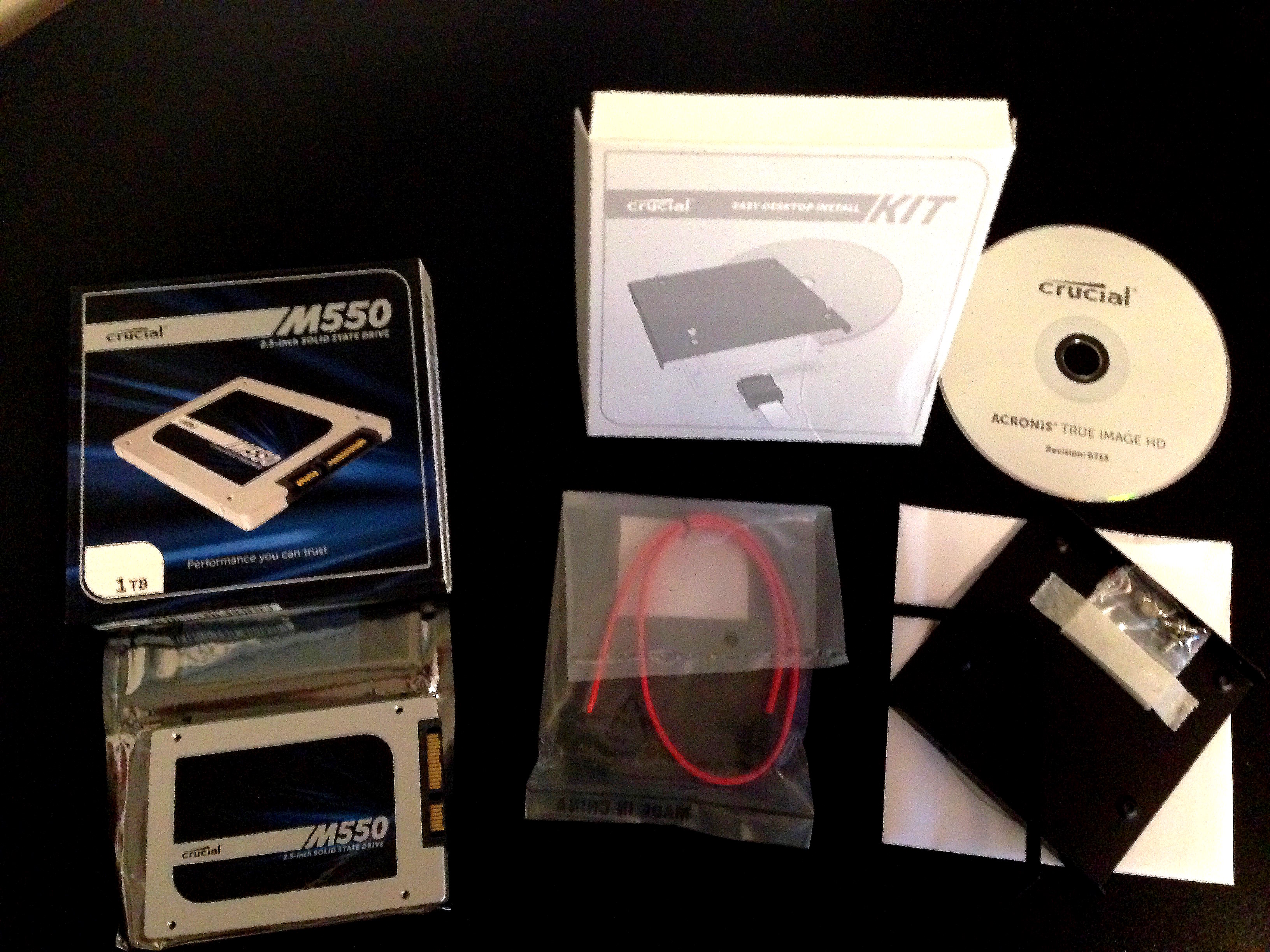 I had ordered a Crucial M550 one-terabyte drive with a SATA interface from Amazon for $432. I also purchased a $24 desktop installation kit which provided a SATA cable to connect the drive to the computer’s motherboard, an adapter bracket to fit the laptop-sized 2.5″ wide drive into a desktop’s 3.5″ bay, and Acronis TrueImage HD software to help me migrate my system from my one-terabyte hard disk to the solid state drive.