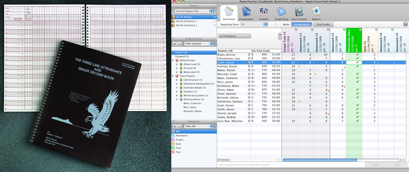 I maintain a paper gradebook for three reasons. First, I am a stickler for tracking attendance and tardies, and the PowerTeacher program at school isn’t designed to help me keep close track of that at a glance during my hectic class time. Second, I hate scrolling up and down or mousing about in a digital gradebook to put in grades. So after I grade a set of papers, which I sort by the seating chart since lab groups sit together in my room, I manually write the grades into my paper gradebook. That lets me quickly type them into PowerTeacher using a numerical keypad. Finally, I like having an analog copy of the gradebook so that I never have to print nor save a digital copy of the gradebook in case of a database disaster or data breach; I always have that analog copy on hand just in case.
