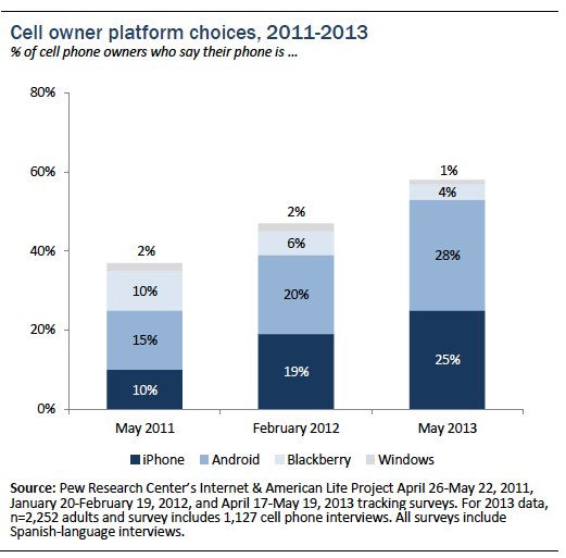 The use of smart phones continued to grow until they dominated other cell phones types by 2013: