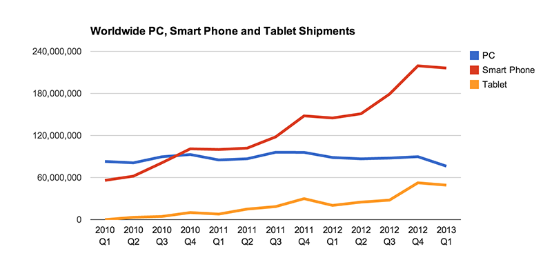 Worldwide, smart phone adoption is still surging ahead, while the more expensive tablets are unstandably less popular but still growing at an admirable pace, while the traditional personal computers, a category lumping together desktops and laptops, is in decline: