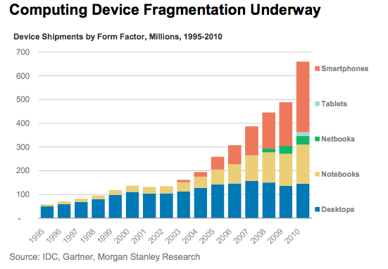 Apple, of course, didn’t make the first smart phone. But its breakthrough interface and design, followed later by Google’s Android phones, helped spur a huge rise in smart phone sales. Note in the chart below how desktop sales flattened as folks adopted laptops (notebooks) and then smart phones: