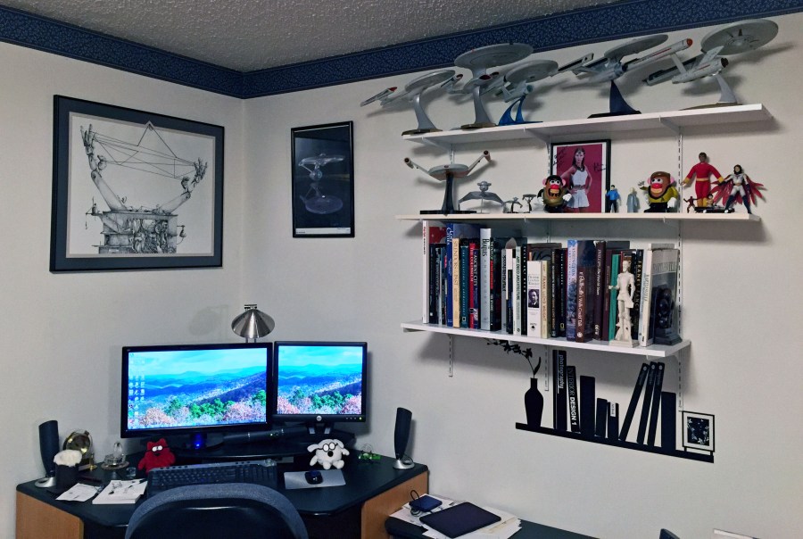 Computer desk with big books, Starfleet, and other toys