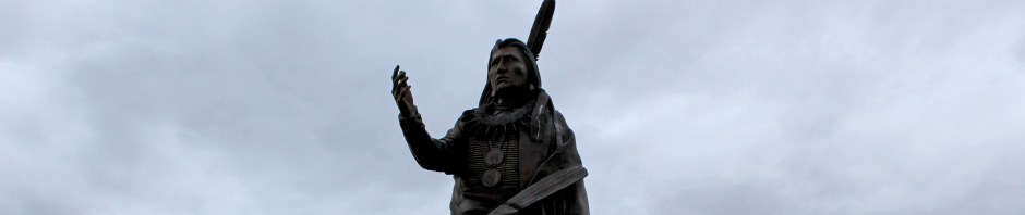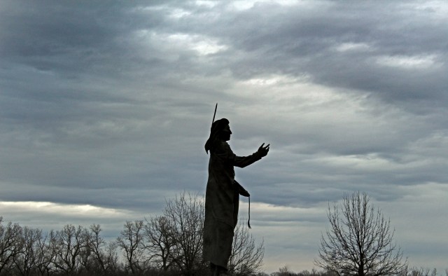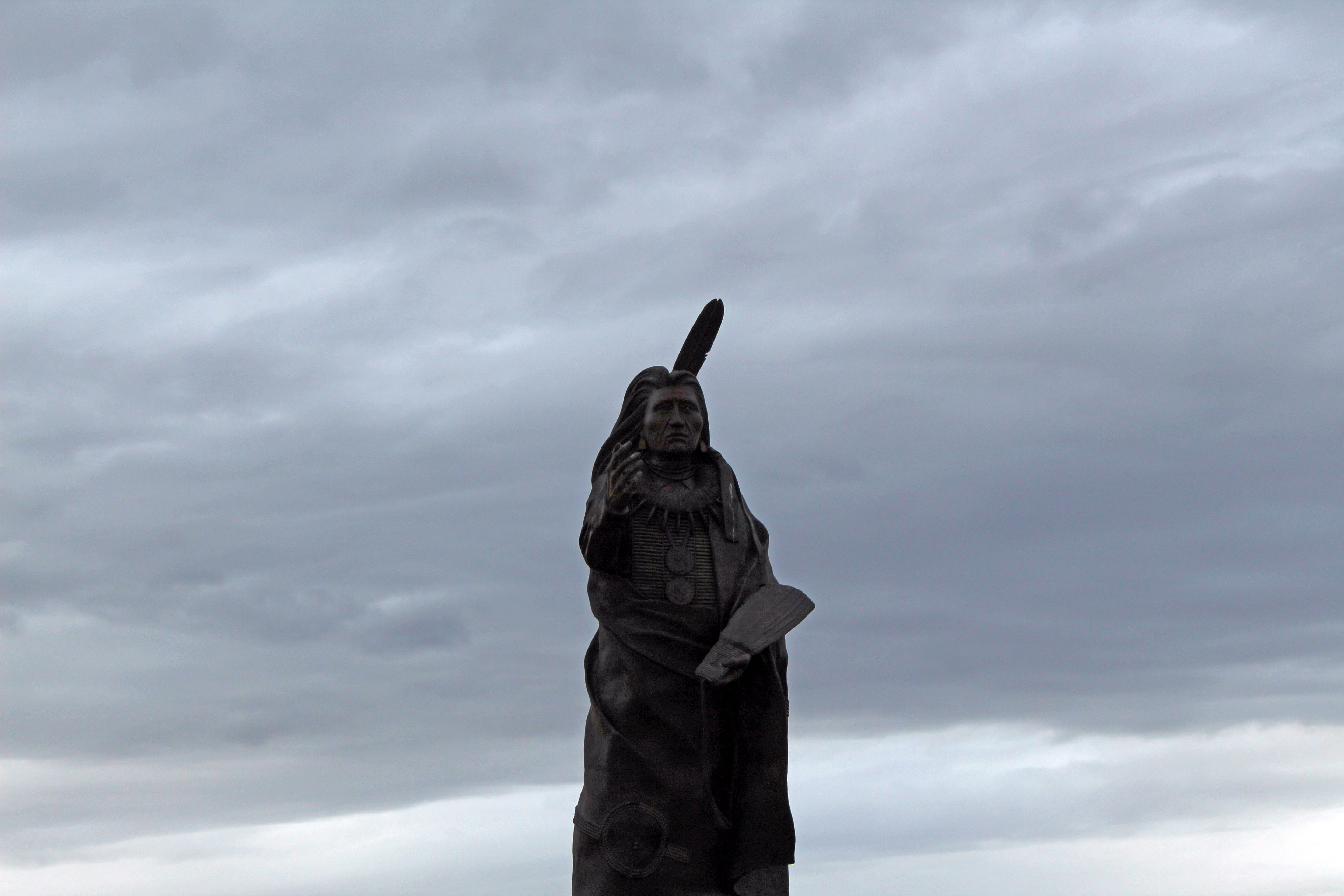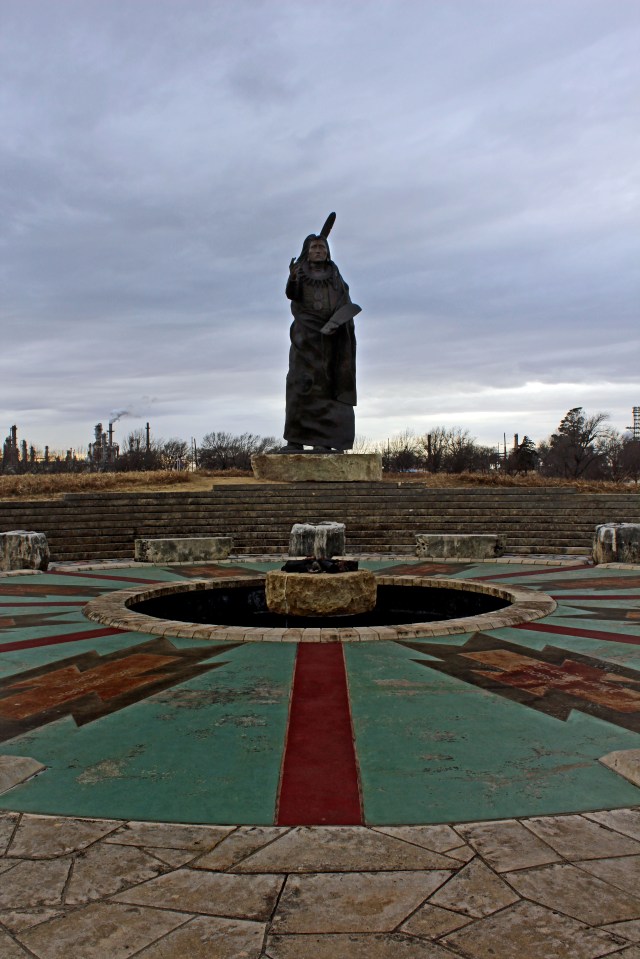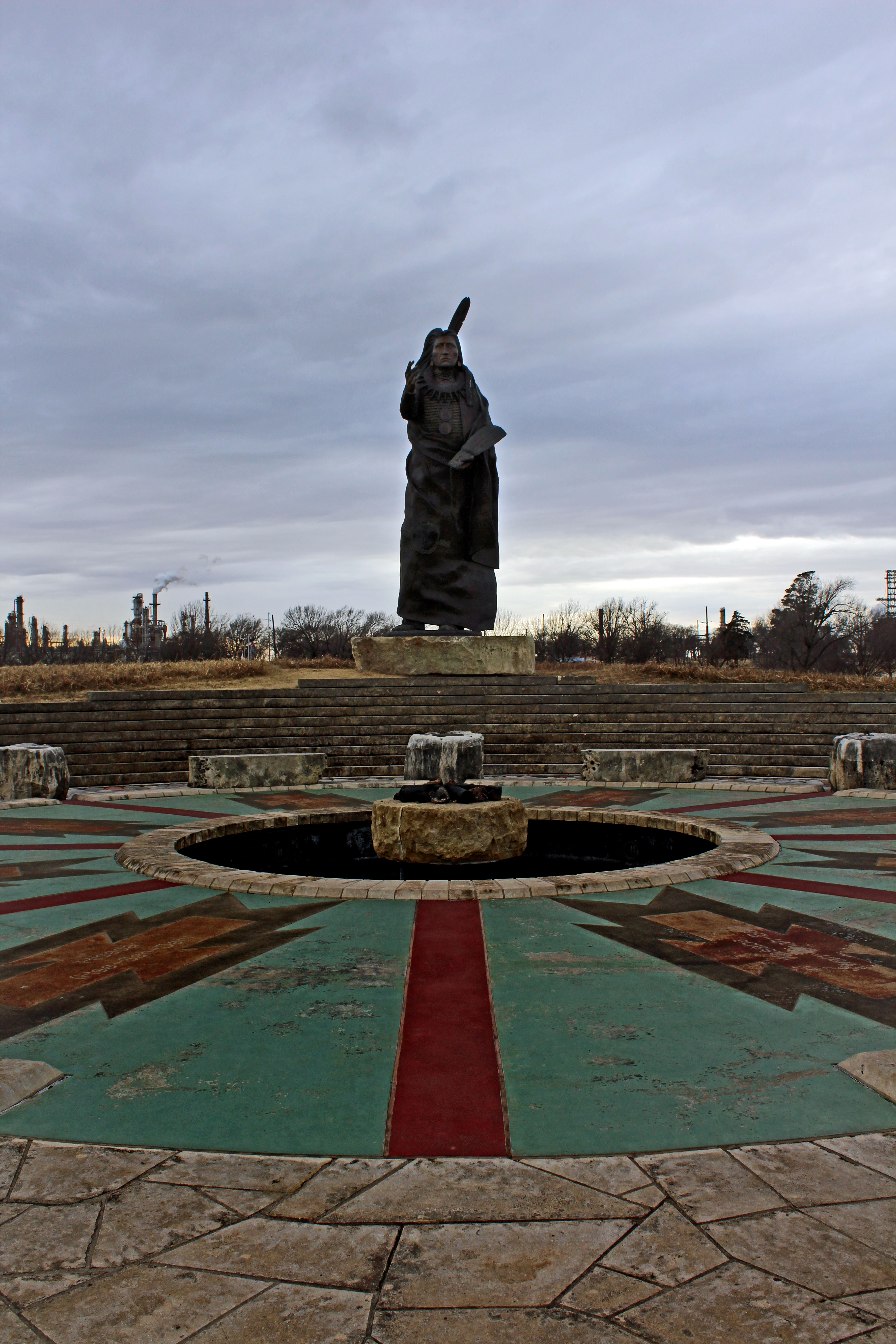 In January 2017, Wendy and I traveled to Ponca City to enjoy the Mexican food at Enrique’s restaurant. As we drove through town, we spied a large statue of a Native American just north of the Phillips refinery. Intrigued, we drove into Standing Bear Park. We found an elaborate trail with large sigils of various tribes, leading us to the 22-foot bronze statue of Standing Bear, gazing out across the land.