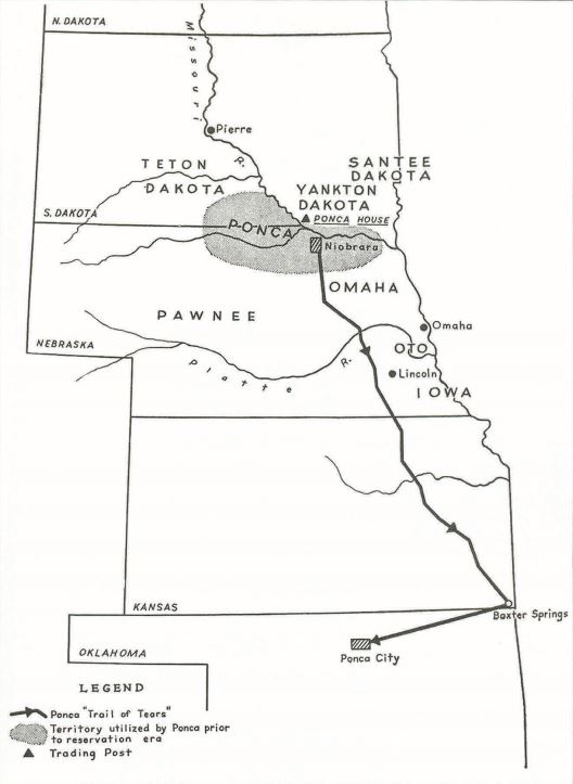 In May all of the Poncas were forcibly removed. At the point of a bayonet, 523 individuals, including Standing Bear, set out with whatever they could carry. By the time they arrived near Baxter Springs, Kansas, nine of them had died, including Standing Bear’s daughter Prairie Flower.