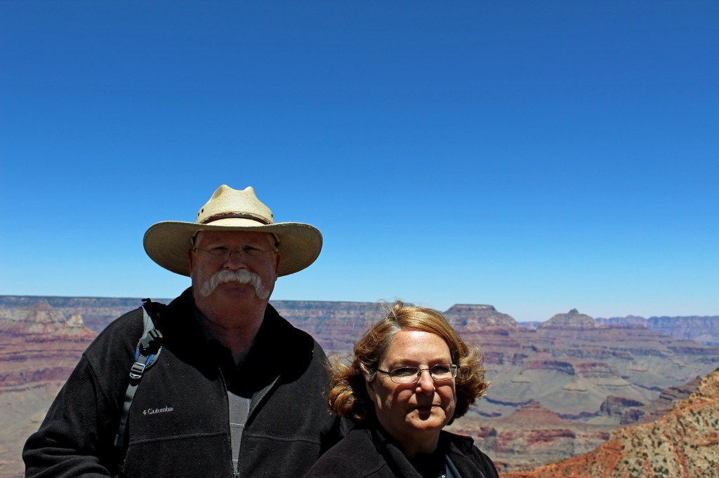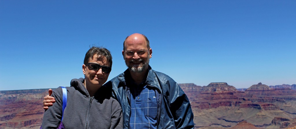 The view was, of course, quite stunning. I remember feeling disoriented upon my first view of the canyon with my father back in 1991, and Wendy had a similar experience upon her first sight of it. She felt dizzy as her mind struggled to interpret the immense chasm, with the North Rim 10 miles away and the canyon bottom a mile below us. The view was literally vertiginous. We exchanged taking couples photographs to celebrate our arrival.