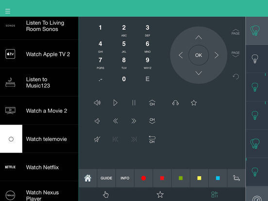 There are also six Smart Home buttons on the remote which are labeled for use with Philips Hue bulbs, programmable outlets, and the like. So I could theoretically put some of my Hue bulbs in the living room lamps and have them automatically adjust for various activities, or use a programmable outlet to control a lamp.