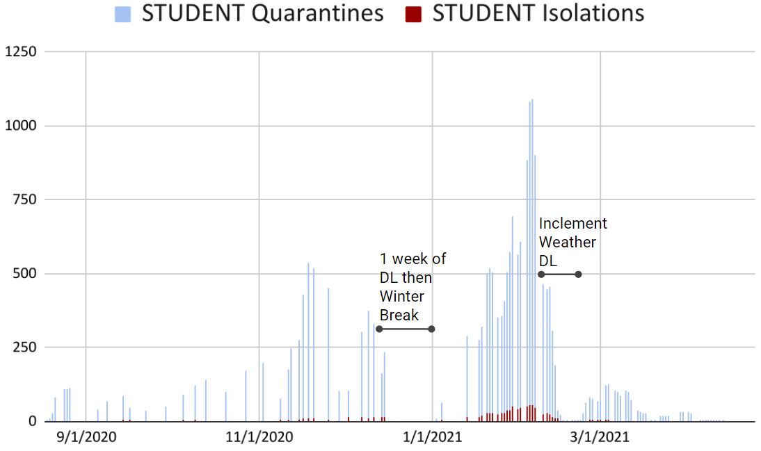 With four weeks of classes left in this school year, we have isolated 321 student cases and imposed 4,794 student quarantines. And in all of that, it is very important for our future planning to note that we have seen no clear signals of school-based spread. We didn’t have any signals of in-school spread even during a stressful peak of student and staff cases in late January and early February, which was happily brought under control by a two-week lockdown from Mother Nature when ice, snow, and severe cold shut down classes and much of the other activity in Bartlesville.