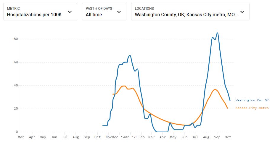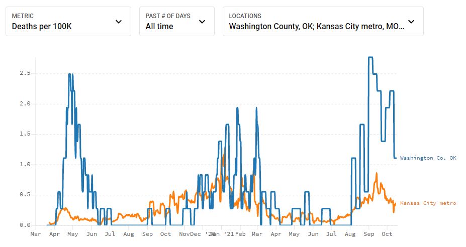 Even with freshly boosted immune systems, would it be wise to spend a few days and nights in a metropolis of over two million people? I’ve been known throughout the pandemic for publishing and interpreting many data graphs, so naturally I created comparisons of Bartlesville’s Washington County to the Kansas City metropolitan area: