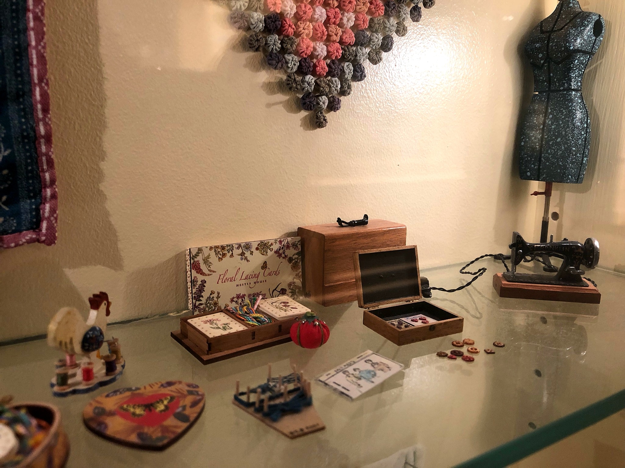 In the first room of miniatures, a violin maker’s shop, with multiple instruments, had been crafted inside a violin. There were various knitted or crocheted items smaller than one’s thumb, tiny sewing items and buttons, incredibly small plates, cups, and saucers, and blueware.