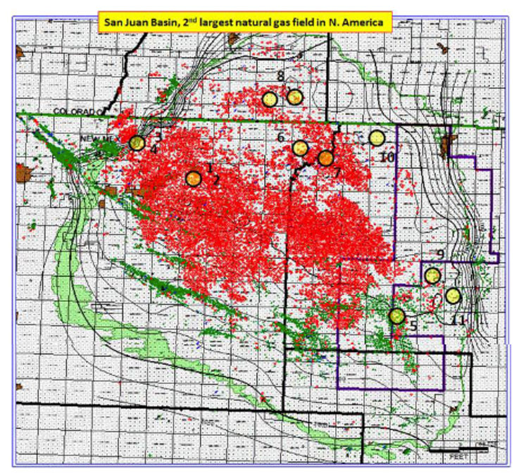 Well, it turns out that the San Juan Basin east and south of Bloomfield has over 40,000 natural gas wells, which are the red dots on the map below.