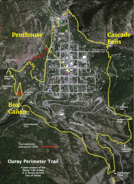 Our vacation involved almost daily travels between hotels, so we needed some extra time in Ouray to afford a wee bit of hiking, to recuperate from frequent hotel shifts, and to wash some clothes and thus avoid having to pack and schlep too much baggage. In planning the trip, I had looked for a nice rental, instead of a hotel, and found at VRBO the Alchemist Penthouse. Retired pharmacists Curtis & Nancy Haggar had constructed a museum on the ground floor, their home on the second, and a rental penthouse up top. It looked spectacular with an outdoor deck in back and a balcony high above Main Street. Better still, our host Nancy was delightful to work with.