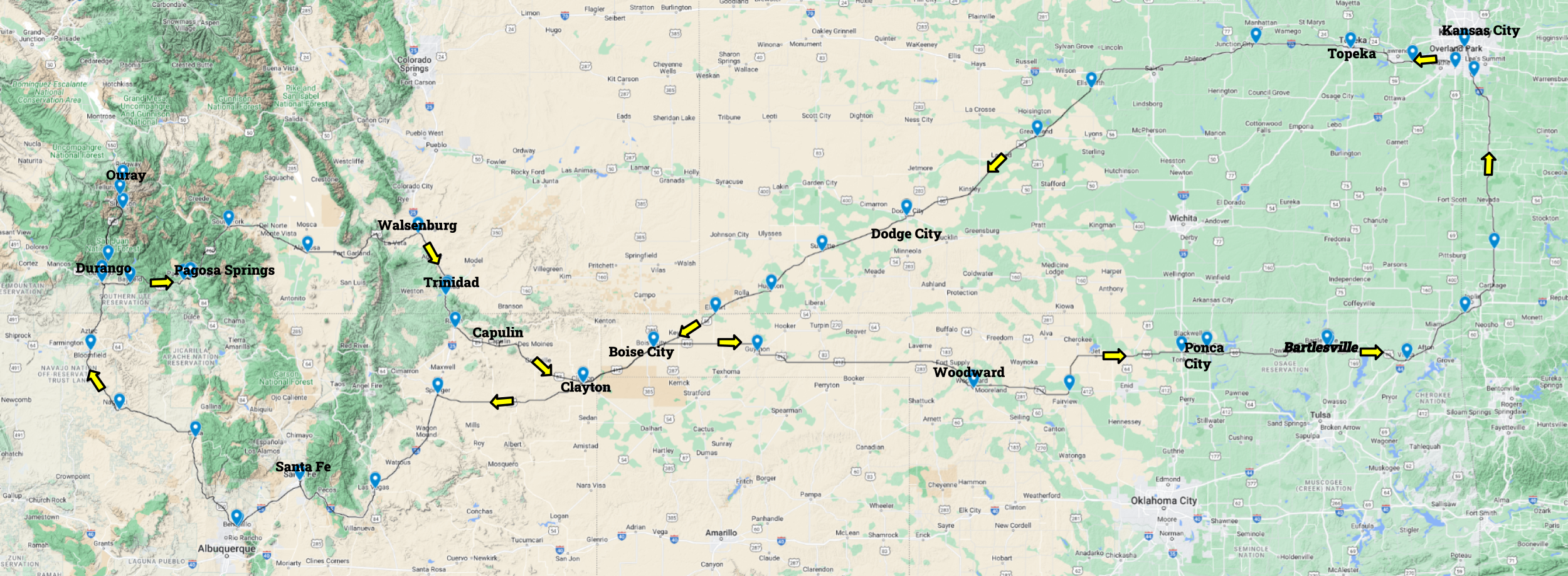 We then traversed the full length of the Oklahoma Panhandle and drove to Woodward for the night. We had lunch in Clayton, New Mexico. We wound up at a Pizza Hut after other choices had provided the post-pandemic Nos we had grown accustomed to. The Pizza Hut actually had a large seating area with comfortable booths, unlike many of the franchises these days, which often have worn-out booths if they offer seating at all. So that, decent food, and excellent service from a young waitress were most welcome.