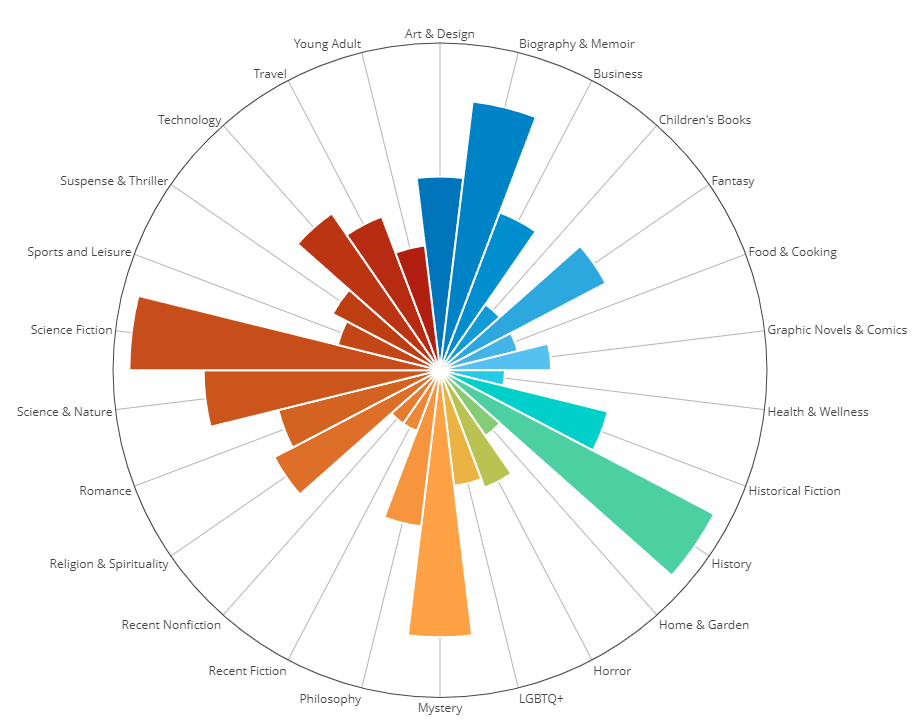 My top genres over the past 15 years are science fiction, history, biography & memoir, mystery, and science & nature. Below I provide some details on my history with each of those top genres.