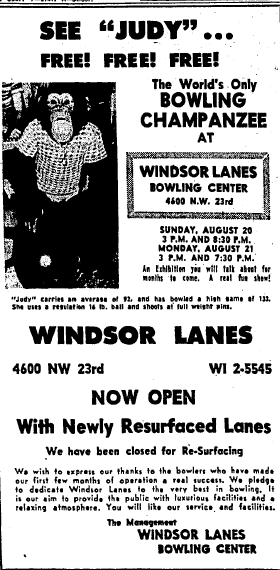In 1961 it closed to resurface its lanes, and promoted its reopening with appearances by Judy, the world’s only bowling chimpanzee, who carried an average score of 92 using a regulation 16 pound ball, shooting at full weight pins. C. Terry Cline, Jr., a slender redhead from Thomasville, Georgia, had trained Judy Rose to bowl, and they appeared at alleys across the country. He said at the time, “I wouldn’t trade this way of making a living for any other.” Terry later had a Land Alive program that brought exotic animals to schools. At age 37, he sold his business to concentrate on writing novels, selling his first novel at 40, and ten of his novels were published before his death in 2013.