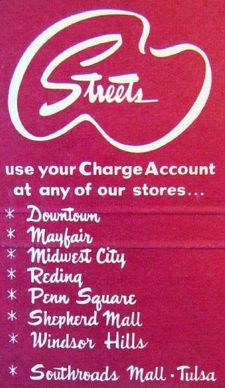 I also dreaded being dragged into Streets, as they sold moderately priced women’s and children’s apparel. The company was founded in 1930 by Theodore Greenberg at a site on West Main in Oklahoma City, later occupied by the Sheraton Century Center. He was a retail pioneer, setting up customer charge accounts as early as 1931. That’s a strong contrast to James Cash Penney, who had insisted on a strict cash-and-carry policy in his Golden Rule and Penney’s stores to prevent customers from building up debt. But even Penney’s began selling items on credit in 1958.