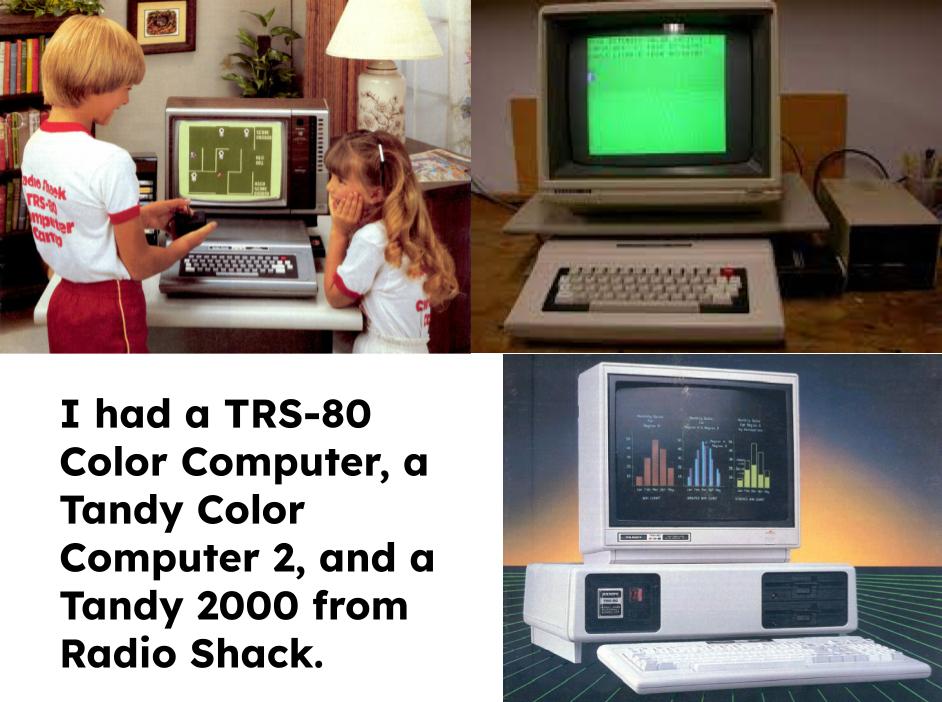 I was a nerd, so I had long enjoyed browsing in Radio Shack and perusing their catalogs. My parents bought me my first computer, a TRS-80 Color Computer with 32 kilobytes of memory, from one of its many stores. We later purchased a Tandy Color Computer 2 and a Tandy DWP-210 daisy wheel printer. For college, I got a Tandy Model 2000 with a Tandy DMP-430 dot matrix printer. See Granger’s Computers for all of the nerdy details.