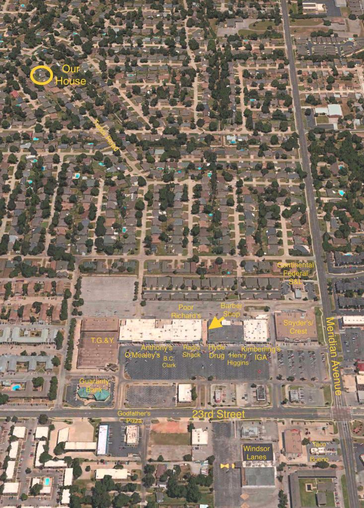 A 1959 sketch of the shopping center is close to what was originally built. From left to right it showed O’Mealey’s cafeteria, C.R. Anthony Co., and Kresge in the western building. The eastern building showed Hyde’s Drug, an OTASCO (Oklahoma Tire & Supply Company), and a Kimberling’s IGA grocery store. Twenty years later, those were all there for me to visit, except for Kresge and OTASCO.