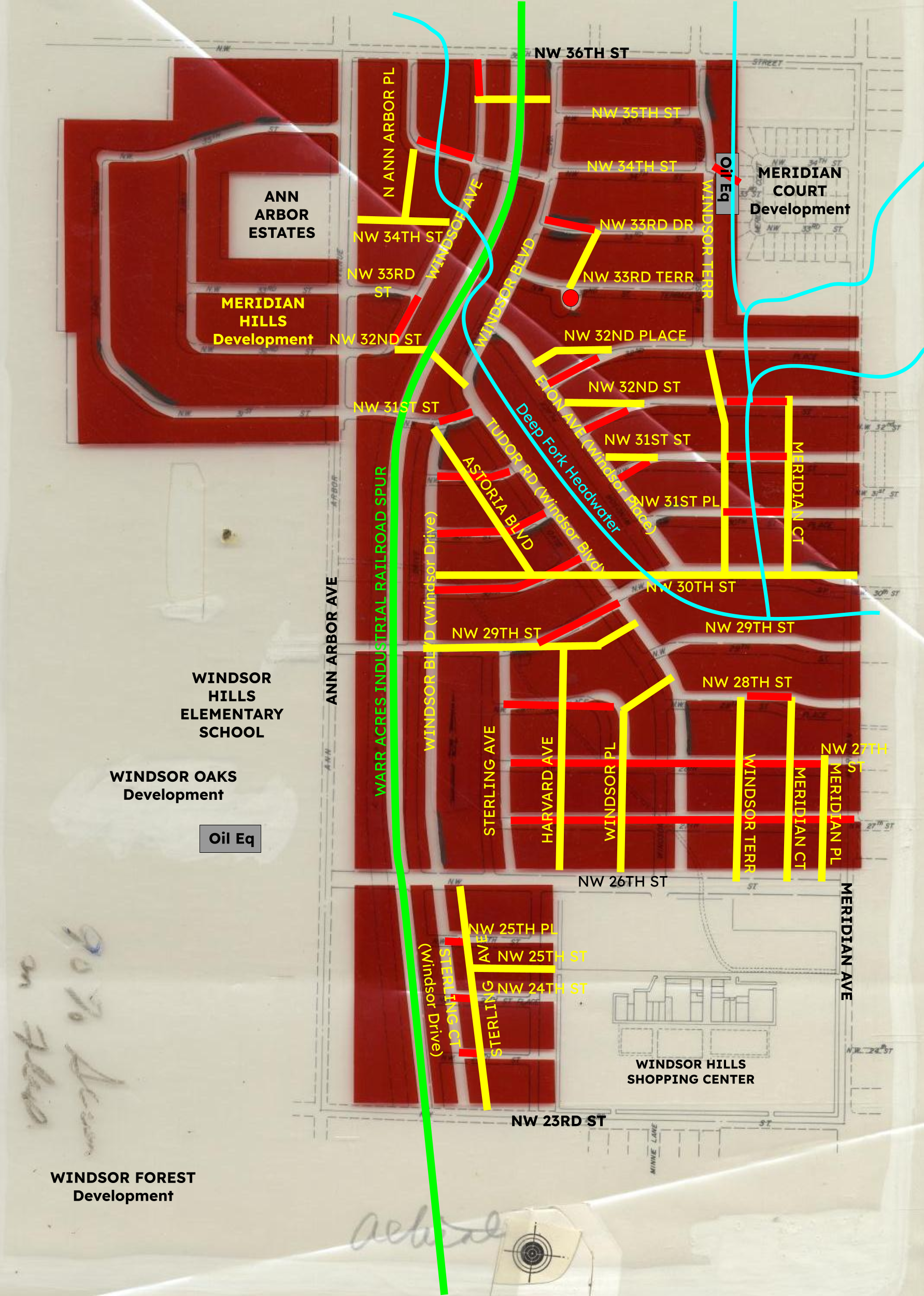 While much of the initial street layout for Windsor Hills is recognizable, it was altered considerably as I’ve shown above, where deleted streets are in red and added ones are in yellow. Cutting up the east-west streets calmed the traffic in the neighborhood, although I don’t know if that was the central motivation for the changes. The adjusted layout meant traffic concentrated on 26th and 29th/30th, with Tudor Rd/Windsor Blvd as the only north-south through street.