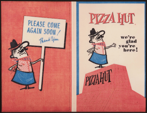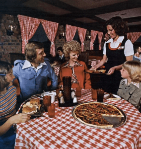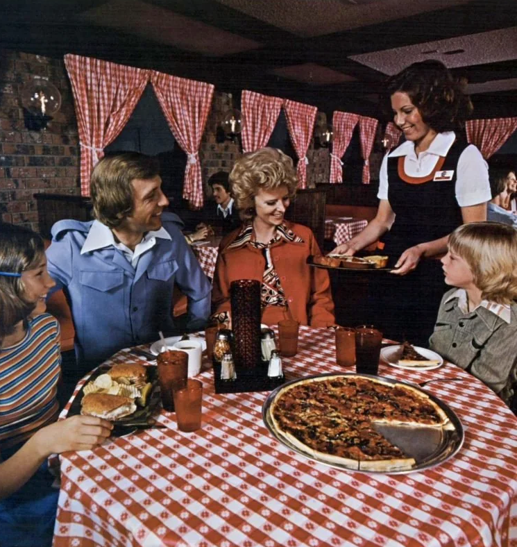 The brothers became worried about competition from Shakey’s in the 1960s, so they decided to distinguish themselves with a standardized and iconic design. They contacted Richard D. Burke, a Wichita architect and artist who had been a college friend and fraternity brother. He requested a $32,000 upfront fee, which they couldn’t cough up, so they agreed to instead pay Burke $100 per restaurant. But other sources claim the distinctive design with the red roof and trapezoidal windows was designed by Chicago architect George Lindstrom in 1963 and adopted in 1969.